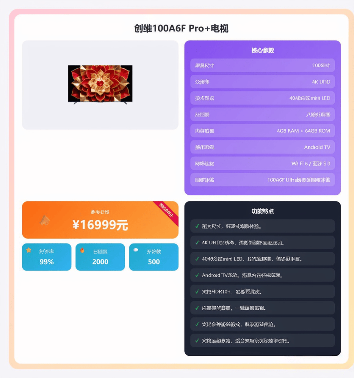 当然,如此强悍的性能也代表着它需要更大的空间来承载。这款电视更适合拥有宽敞客厅、对影音品质有极致追求的家庭影院爱好者。它不单单是一台电视,更像是一件彰显品味和科技感的家庭娱乐中心。如果你追求的是目前市面上顶尖的画质和音效,并且预算充足,那么这款100A6F Pro+无疑是你的终极目标之一。